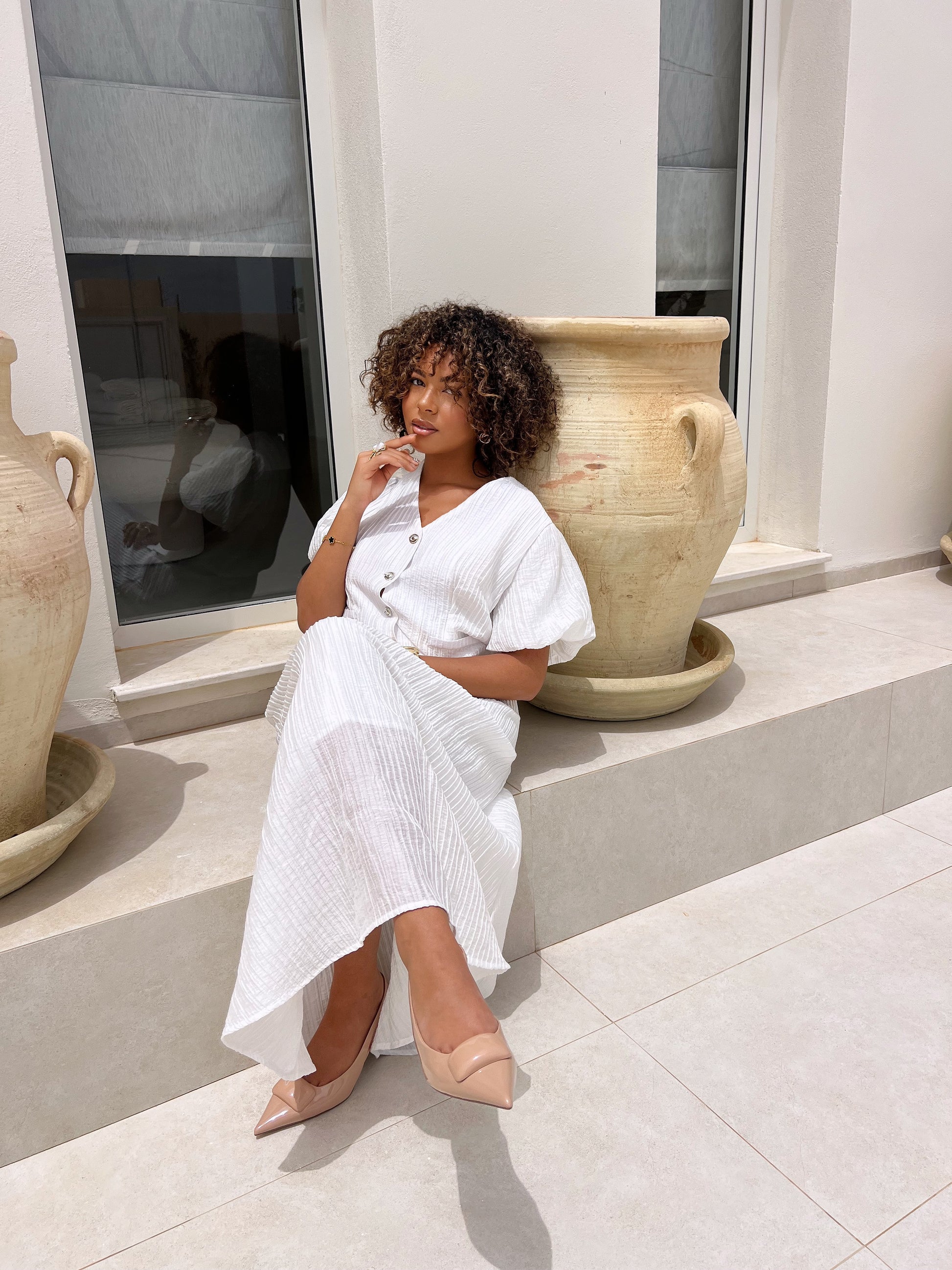 Ensemble Mykonos blanc éclatant, composé d’une jupe plissée fluide et d’un haut élégant — l’alliance parfaite entre fraîcheur et raffinement estival.